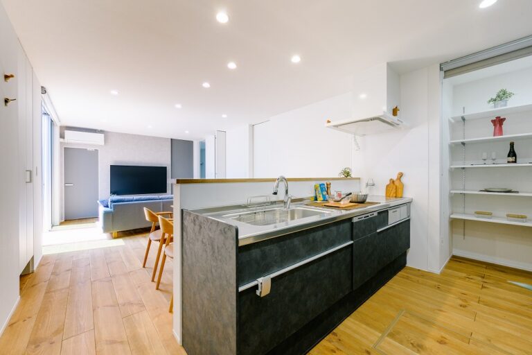 キッチンはダークグレーの扉色。対面キッチンの良いメリットを活かして、空間を区切ってます。
