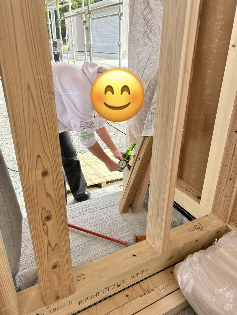 建物の4隅の角にお酒と塩でお清めです♪