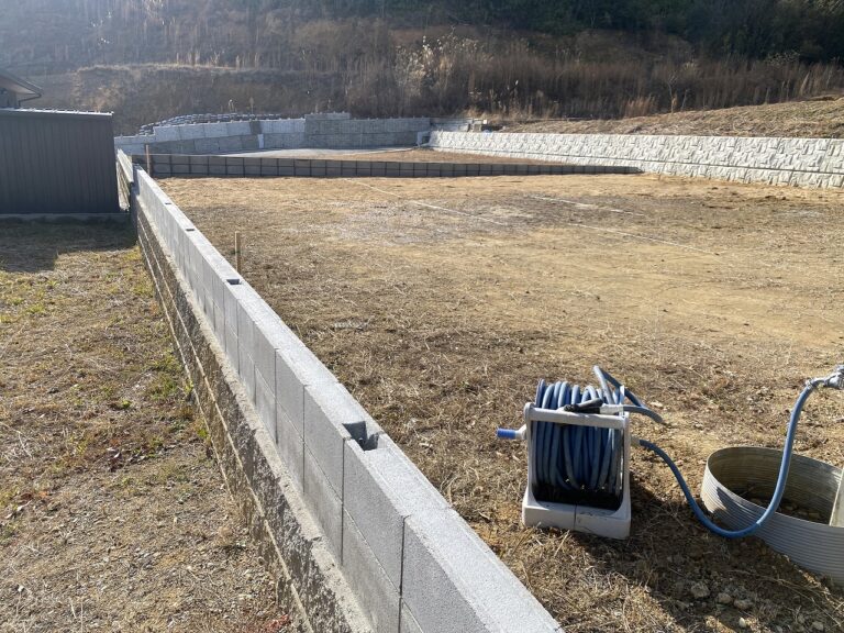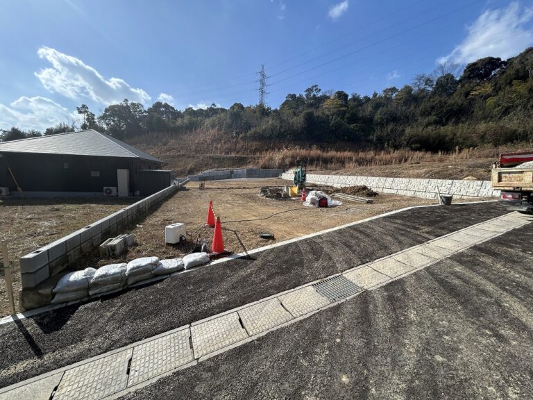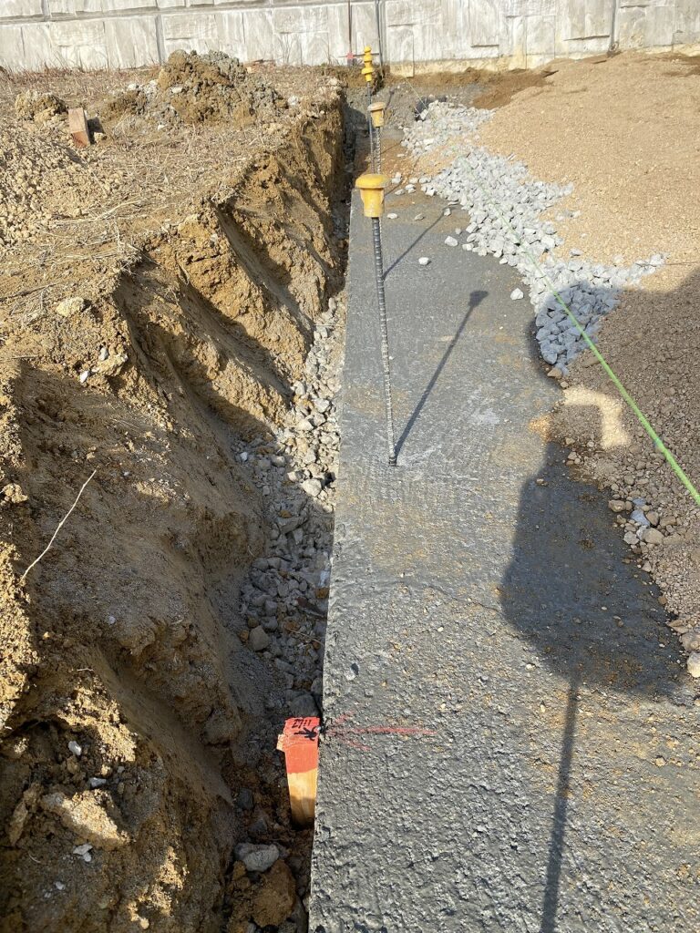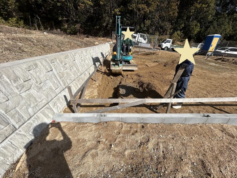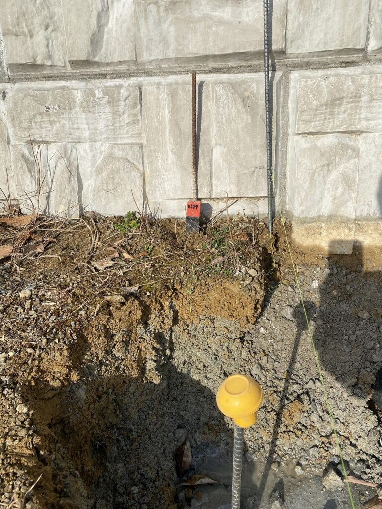 掘り方を行うと境界杭の位置がずれるので境界杭の復旧作業も前もって段取りしていきます。